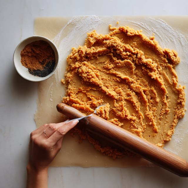 Stir in the pumpkin purée, melted coconut oil, maple syrup, and vanilla. Mix gently until a soft dough forms. If it feels too dry, add a splash of almond milk just enough to bring the dough together. - Roll Out the Dough:
