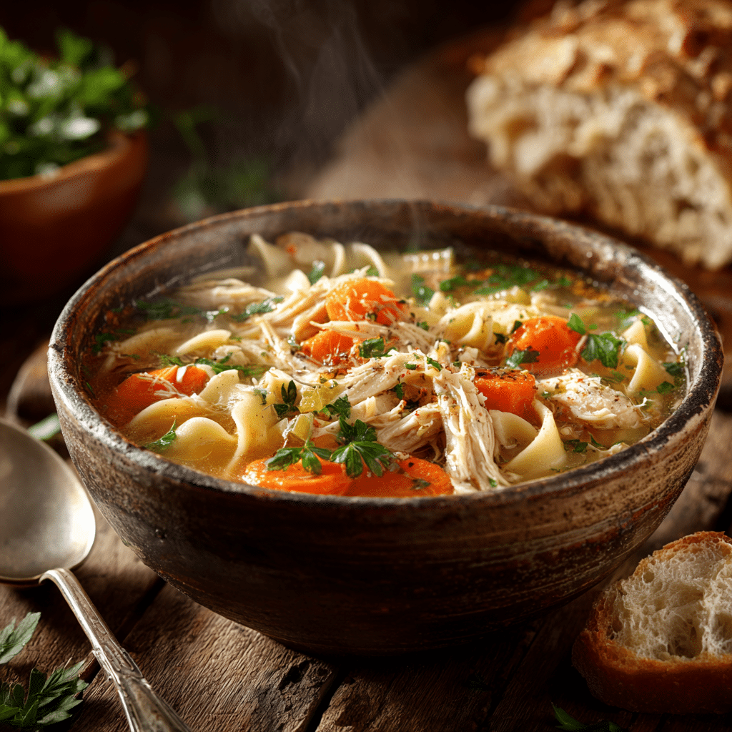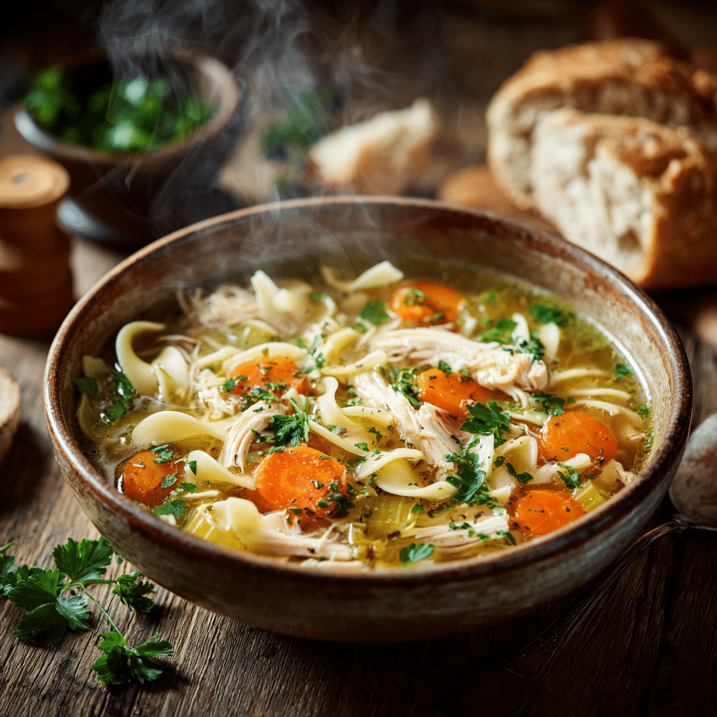 My Homemade Chicken Noodle Soup is the ultimate comfort food. Tender chicken, hearty noodles, and fresh vegetables swim in a flavorful broth, creating a warm, satisfying meal. I start by sautéing onions, carrots, celery, and garlic, then add chicken and broth, simmering to let the flavors mingle. I season with thyme, parsley, salt, and pepper, then add noodles until tender. Served with fresh parsley and crusty bread, this soup is a family favorite. Perfect for cozy nights or healing a cold, it stores well in the fridge or freezer. Simple, wholesome, and full of love.