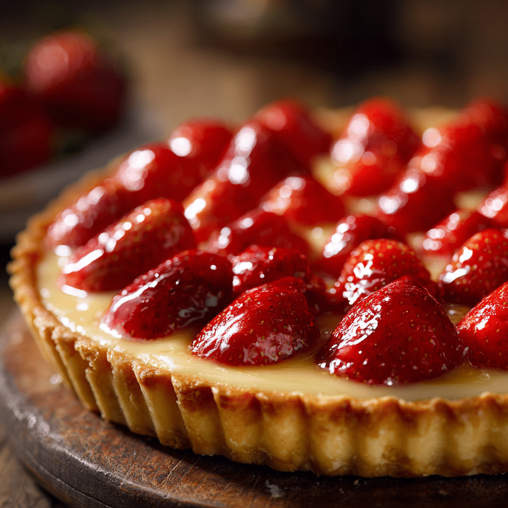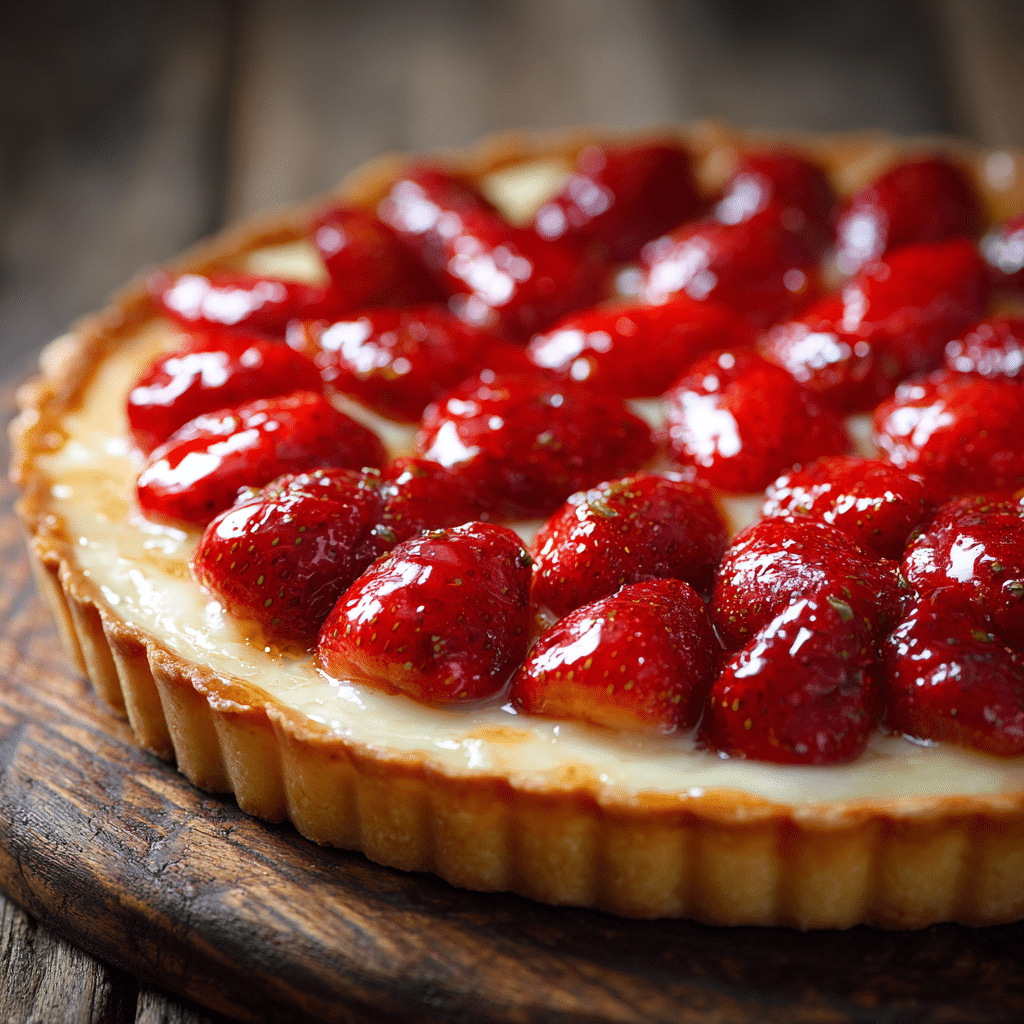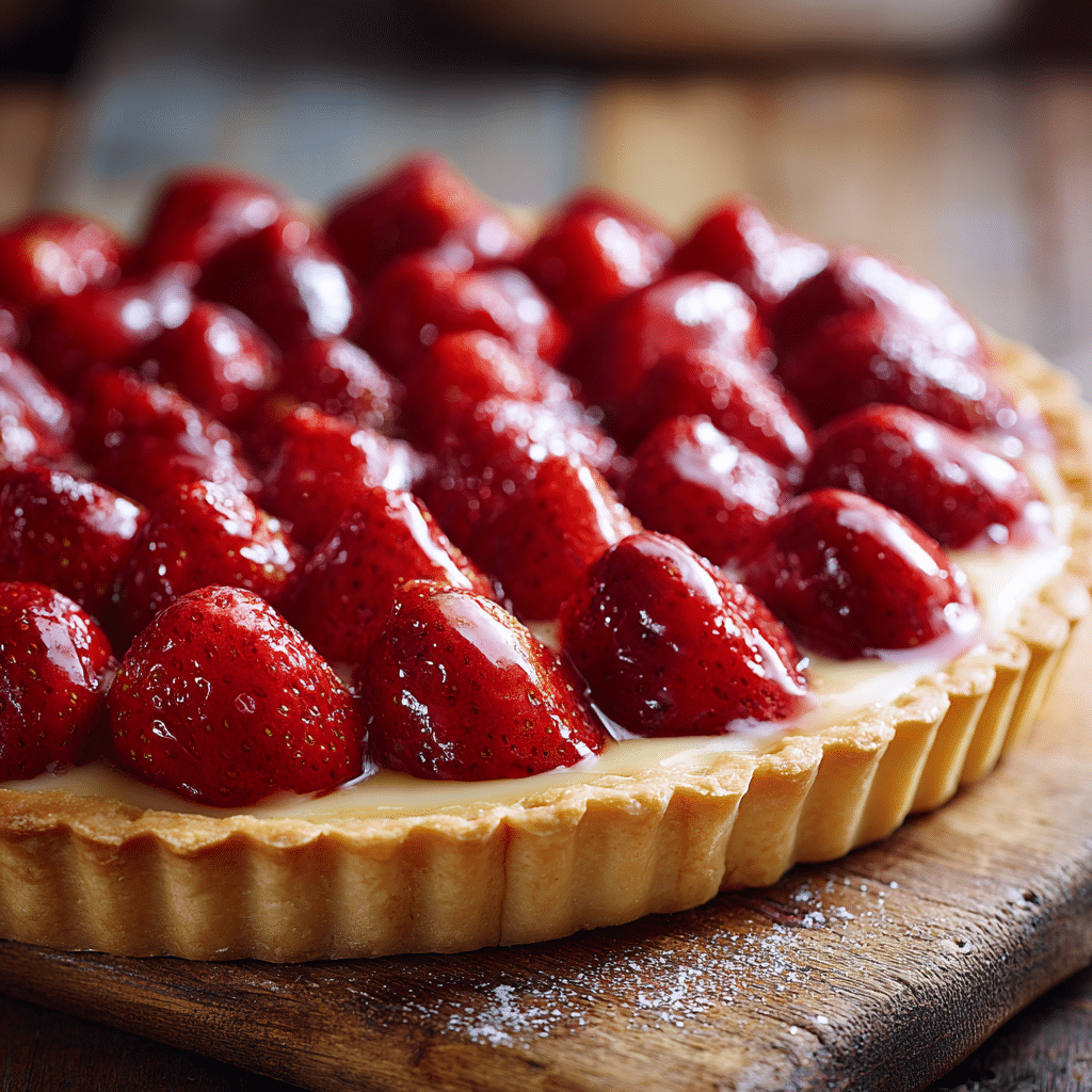 Homemade Strawberry Tart is a delightful dessert featuring a buttery crust, creamy vanilla custard, and fresh, juicy strawberries with a glossy apricot glaze. Perfect for summer, gatherings, or special treats.