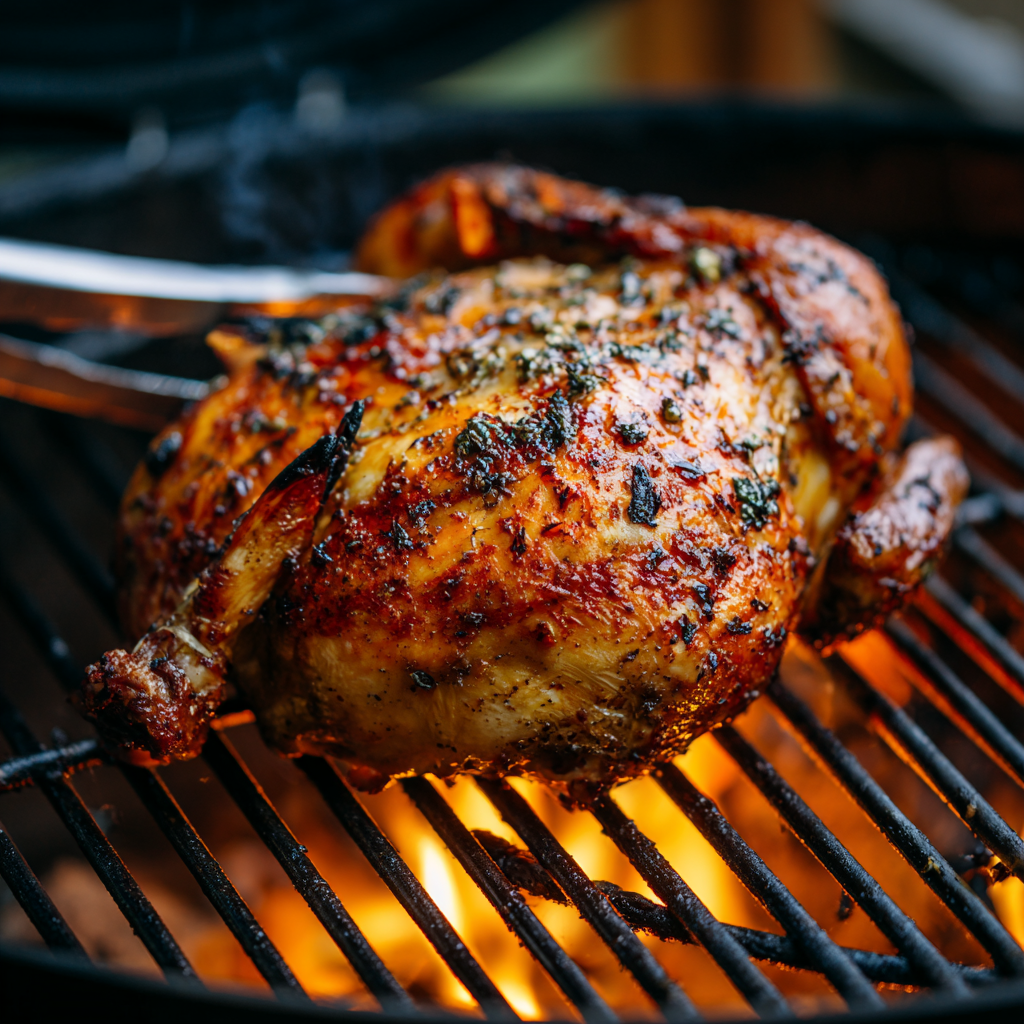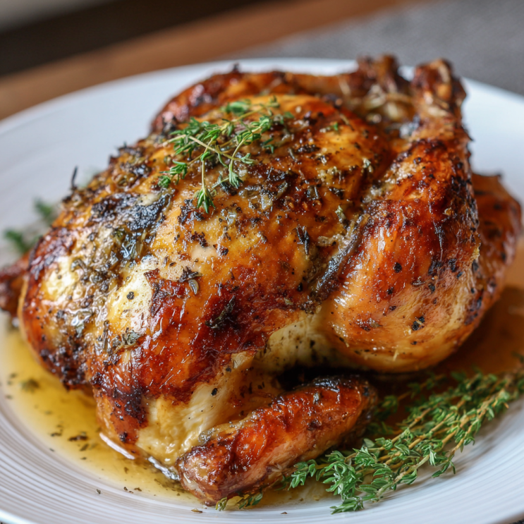 The chicken is ready when the internal temperature reaches 165°F (74°C) in the thickest part of the thigh. Let it rest for 10–15 minutes before carving — this locks in the juices and keeps it moist.