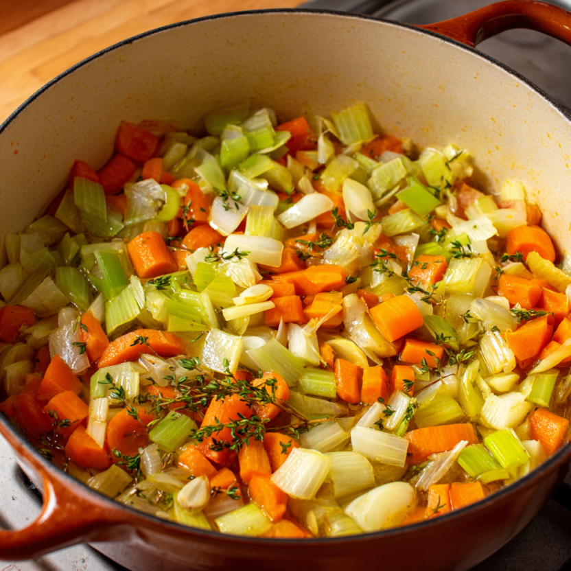 - Heat olive oil in a large pot and sauté onion, carrots, and celery.
