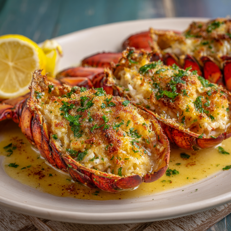 Place the lobster tails on a baking sheet lined with foil or parchment. Bake for 18–22 minutes, or until the lobster meat is opaque and the crab topping is golden and bubbly.