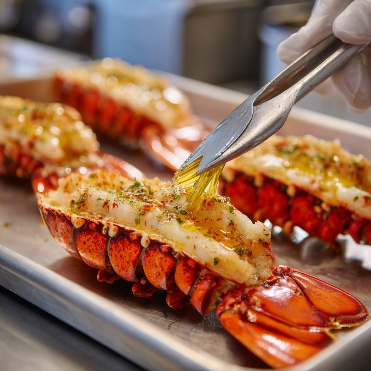 Brush each lobster tail with melted butter, then season with salt, pepper, and a light sprinkle of paprika. This step enhances both flavor and color while your lemon-parmesan crab stuffed lobster bakes.