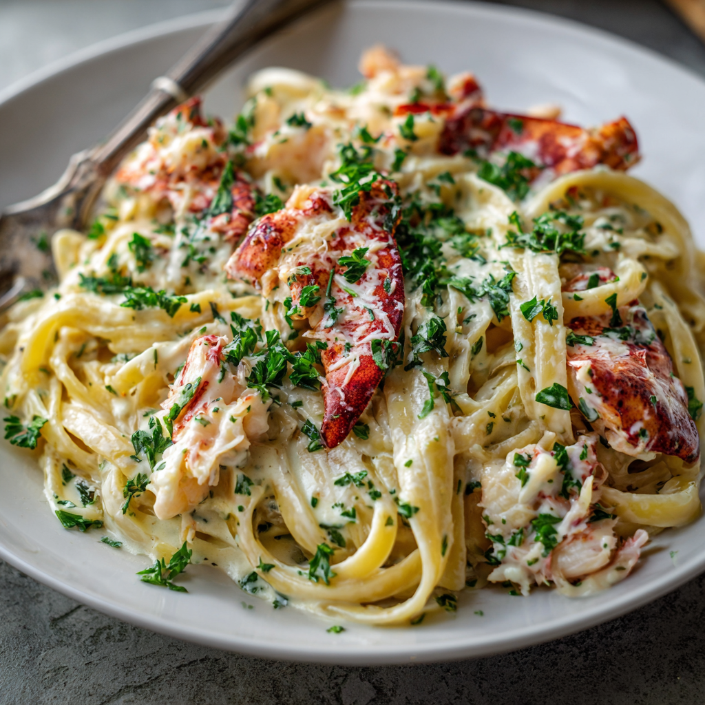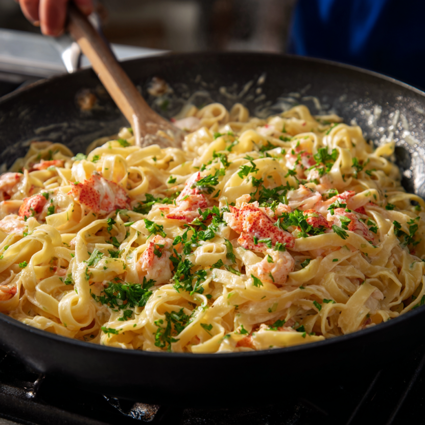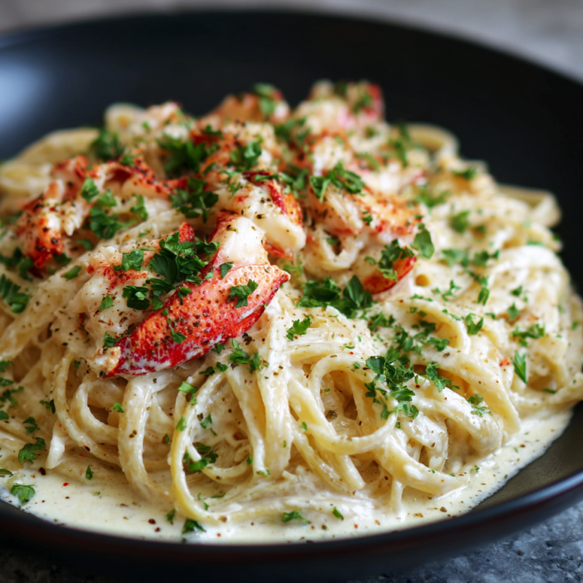 👩‍🍳 Instructions: Cook pasta → Sauté garlic → Add cream & cheese → Toss pasta & lobster → Garnish with parsley