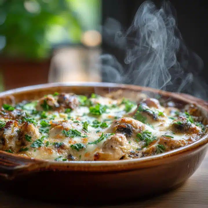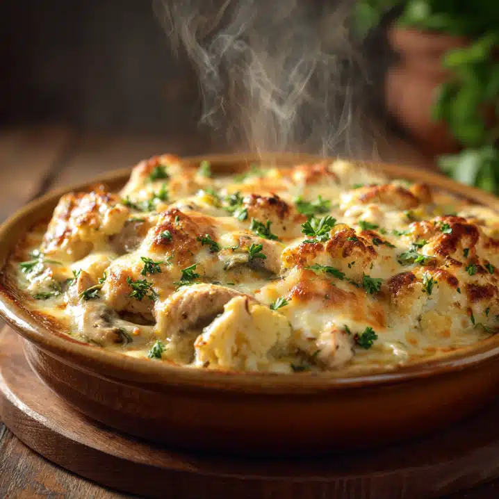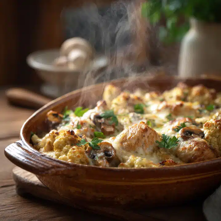 My Low Carb Chicken Casserole is the perfect blend of healthy and comforting. Made with shredded chicken, cauliflower, zucchini, mushrooms, and a creamy cheesy sauce, it’s a hearty, low-carb meal the whole family will love. Seasoned with thyme, smoked paprika, and garlic, it’s baked to golden perfection and garnished with fresh parsley. Quick to prep and versatile, this casserole is perfect for weeknight dinners or meal prep. Store leftovers in the fridge, and reheat for a convenient, satisfying meal. Every bite is warm, cheesy, and full of love a recipe that brings everyone to the table with smiles.