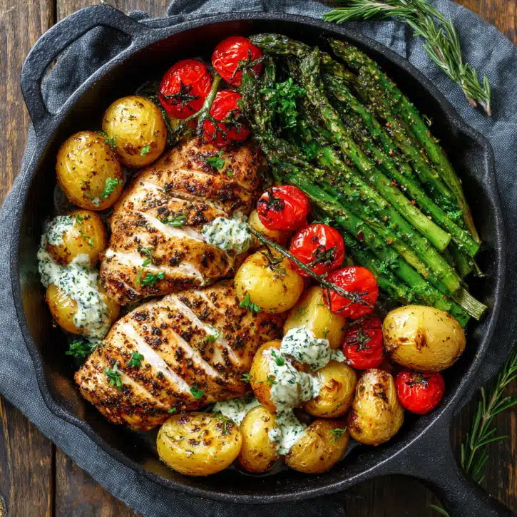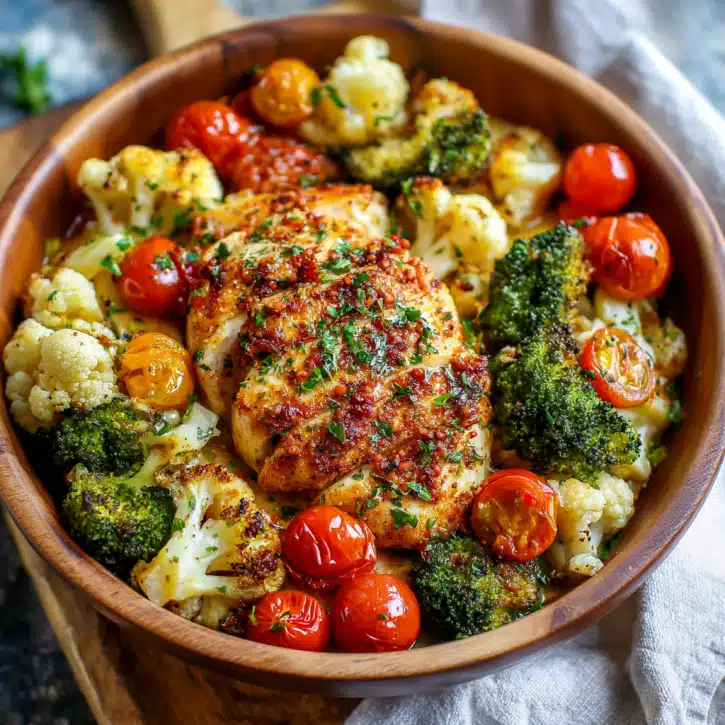 - Roast in the oven for 20–25 minutes until the chicken is fully cooked and vegetables are tender.