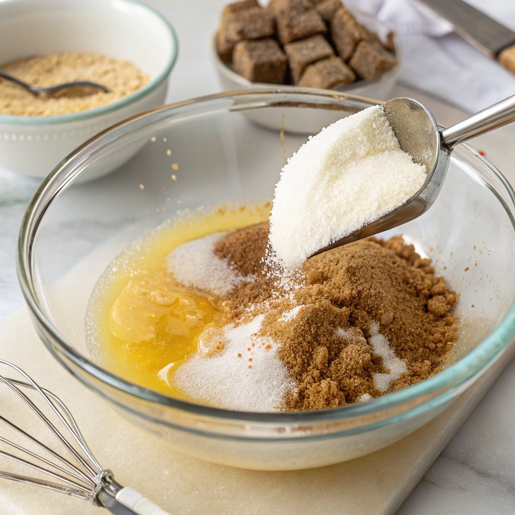 Add both the granulated sugar and brown sugar to the melted butter. Stir well with a spoon until smooth and combined. Then, mix in the vanilla extract and a pinch of salt for flavor balance.