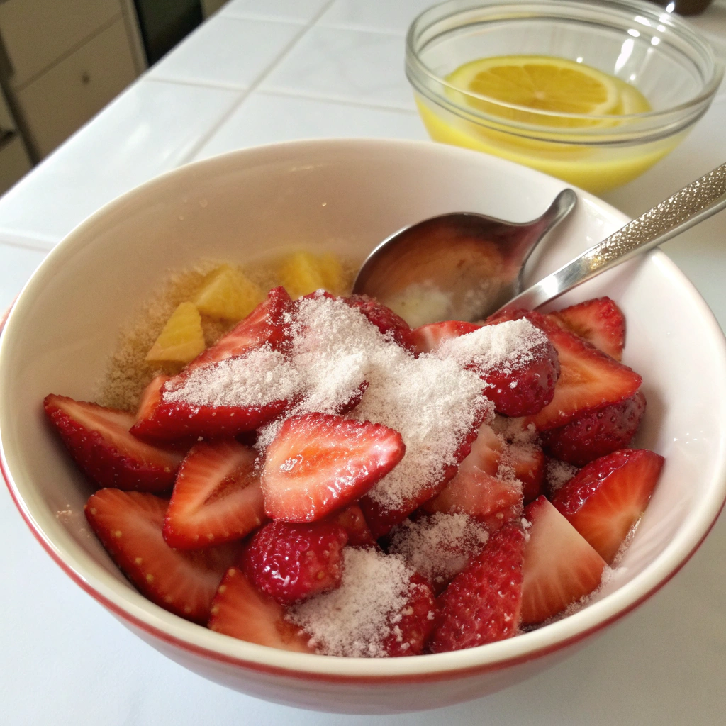 In a medium bowl, combine the sliced strawberries, sugar, and lemon juice. Let them sit for about 10–15 minutes to macerate. This will draw out their natural juices and create a sweet syrup that will soak beautifully into the biscuits.