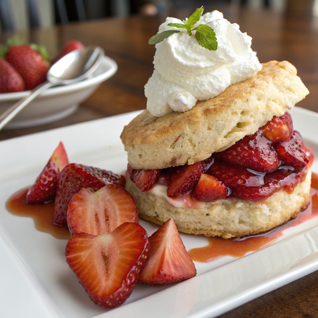 I remember one spring afternoon when the strawberry harvest had just begun. My grandmother handed me a bowl of freshly picked berries and said, “Sweetness comes from simplicity.” She showed me how to make biscuits from scratch just flour, butter, and love. We layered them with strawberries, and I still remember that first bite: warm biscuit, cool cream, juicy berries… absolute heaven.