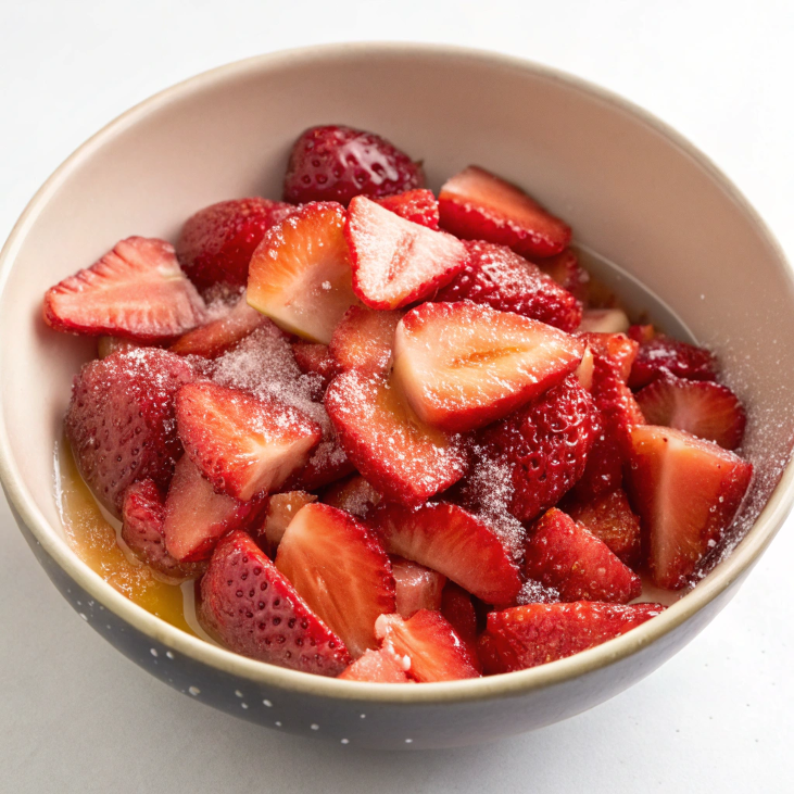 In a medium bowl, toss sliced strawberries with sugar and lemon juice. Let them sit for about 15 minutes to release their natural juices and become glossy and sweet. This process, known as maceration, enhances their natural flavor and creates that perfect strawberry syrup for layering later.