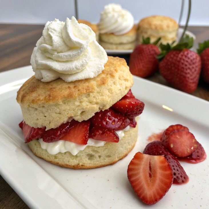 Slice each biscuit in half horizontally. Spoon a small amount of macerated strawberries over the bottom half, add a dollop of whipped cream, and place the top half gently on top. Add a few more strawberries and a swirl of whipped cream on top for presentation.