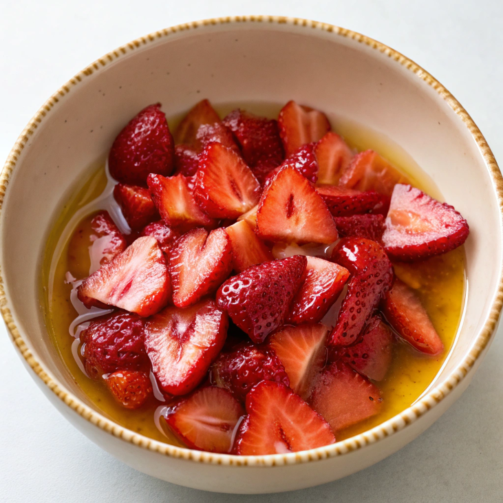 In a medium bowl, toss sliced strawberries with maple syrup and lemon juice. Let them sit for about 15–20 minutes until they release their natural juices this will create that glossy, sweet strawberry syrup perfect for layering.