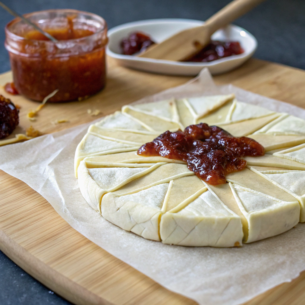 Place the brie wheel in the center of the pastry. If using jam or honey, spread it over the top of the cheese before wrapping. Cut the pastry into long strips, about ½ inch wide.