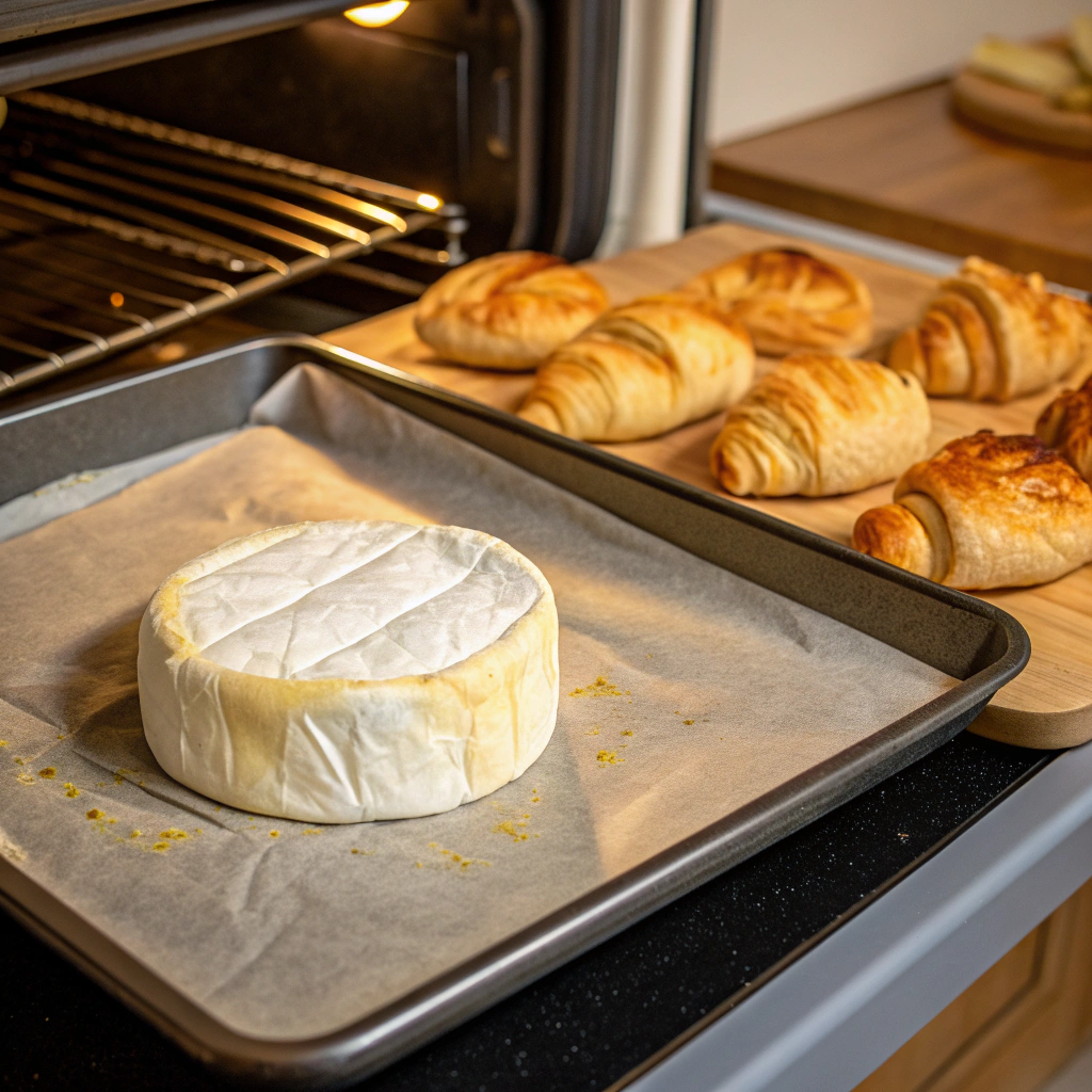 Place the wrapped brie on your baking sheet. Bake for 20–25 minutes, or until the pastry is puffed and golden brown.