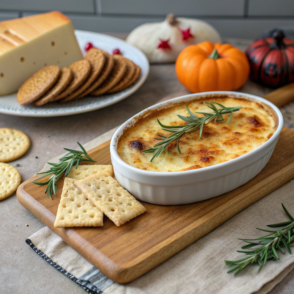 Remove from oven, let it rest for 5 minutes, then transfer to a serving board. Garnish with rosemary sprigs or spooky Halloween decor. Serve warm with crackers, bread, or fruit.