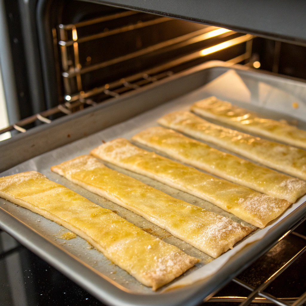 Preheat your oven to 375°F (190°C). Whisk together egg and water for the egg wash, then brush over the pastry strips for a golden finish. Bake for 20–25 minutes until golden brown and crispy. Remove and let cool slightly before decorating.