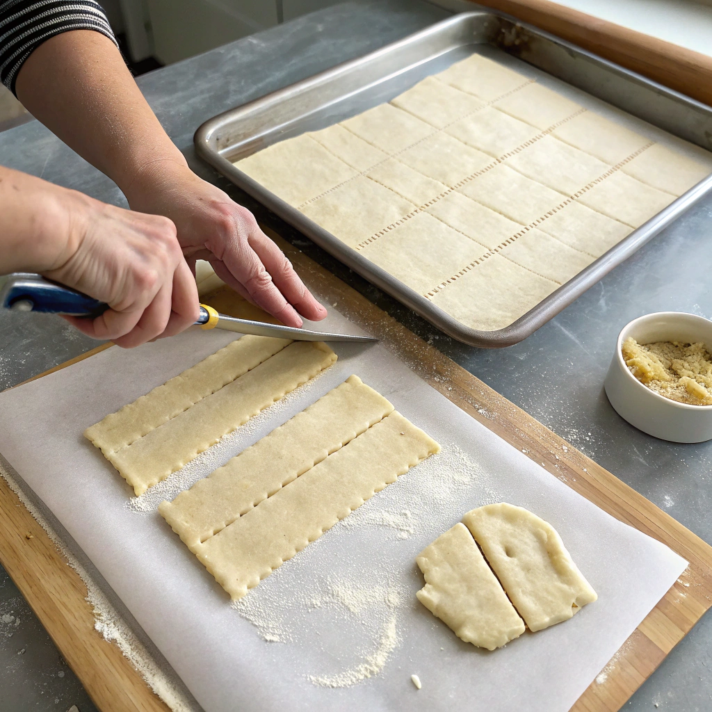 Roll out the pie crust sheets on a lightly floured surface. Cut out rectangles (about 4×6 inches). Place half of them on a parchment-lined baking tray—these will be the bases. With the other half, use a knife or pastry wheel to cut thin strips for the “mummy bandages.”