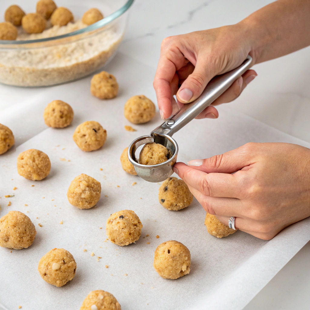 Once chilled, use your hands or a small cookie scoop to roll the mixture into bite-sized balls (about 1 inch).