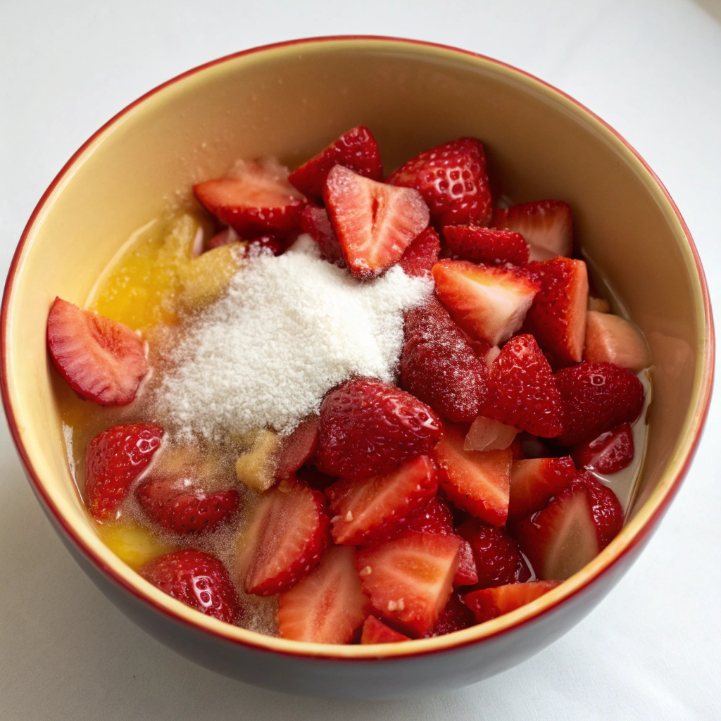 In a medium bowl, combine the chopped strawberries, sugar, and lemon juice. Stir and let them sit for about 10 minutes until the berries release their natural juices. This creates a glossy, sweet strawberry topping.