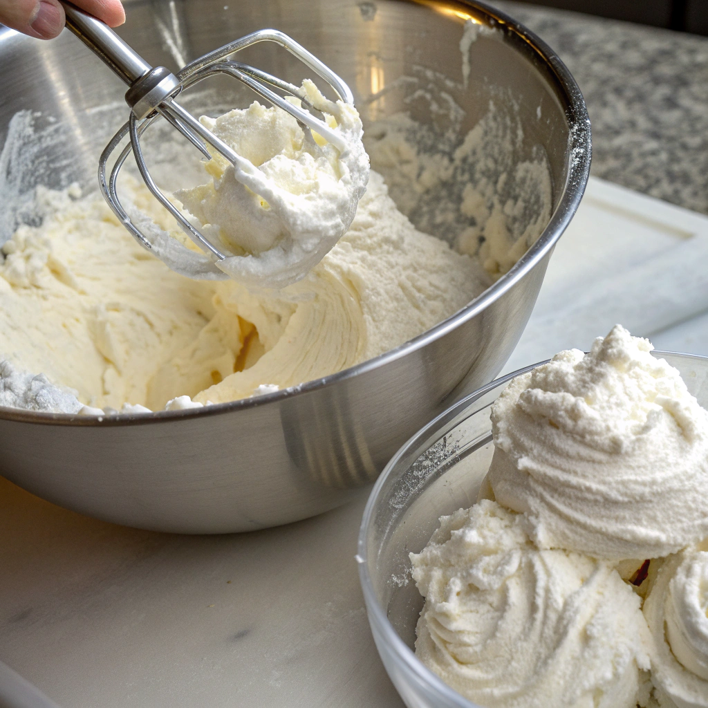 In a separate bowl, whip the heavy cream until soft peaks form. Fold the whipped cream gently into the cream cheese mixture until combined. This creates a light, fluffy filling that’s perfect for layering.