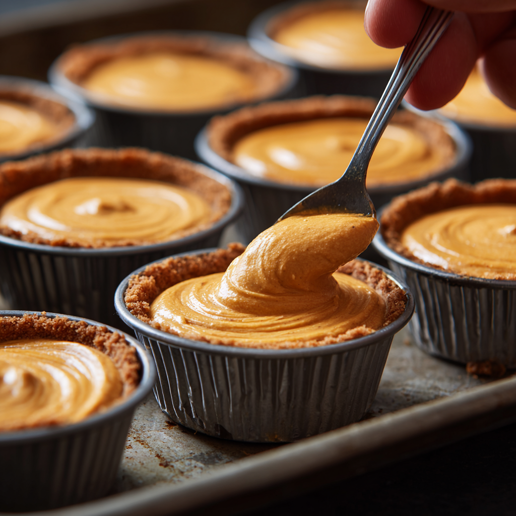 Spoon the pumpkin cheesecake mixture over the prepared crust in each cup. Smooth the tops gently with a spoon or spatula. Layering makes these cups look beautiful, but you can also swirl the mixture slightly for a fun effect.