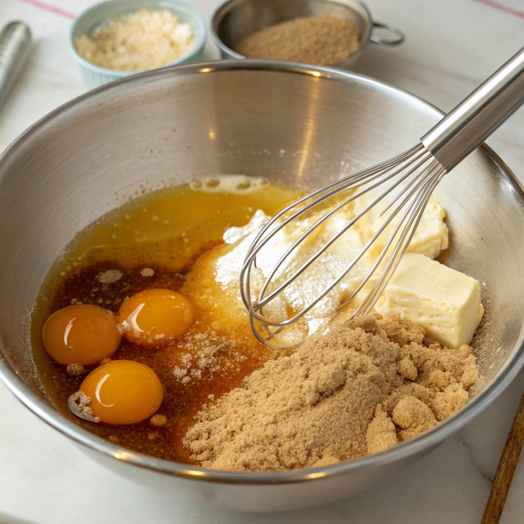 In a large mixing bowl, whisk together melted butter, brown sugar, and granulated sugar until smooth and glossy. Add eggs and vanilla extract, whisking until fully combined.