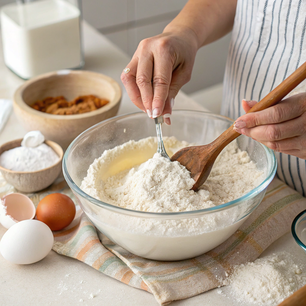 Sift in flour, baking soda, and salt directly into the same bowl. Stir gently with a wooden spoon or spatula until the dough comes together no need for a mixer!