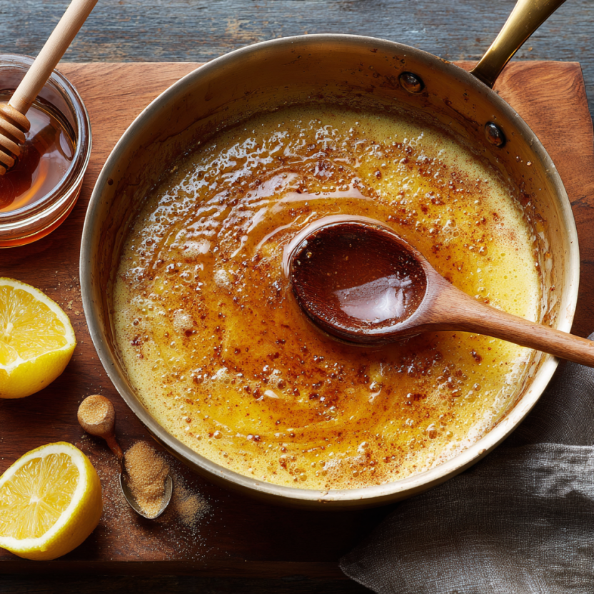 - Melt butter and brown sugar; add orange juice and zest.