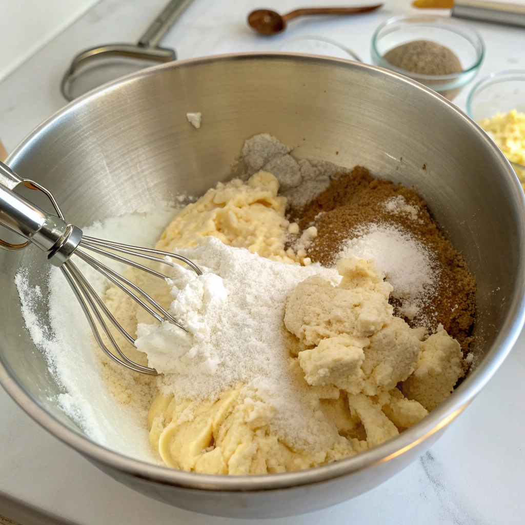 In a large mixing bowl, beat the butter, brown sugar, and granulated sugar together until creamy and fluffy about 2–3 minutes. This creates that melt-in-your-mouth cookie base we all love.