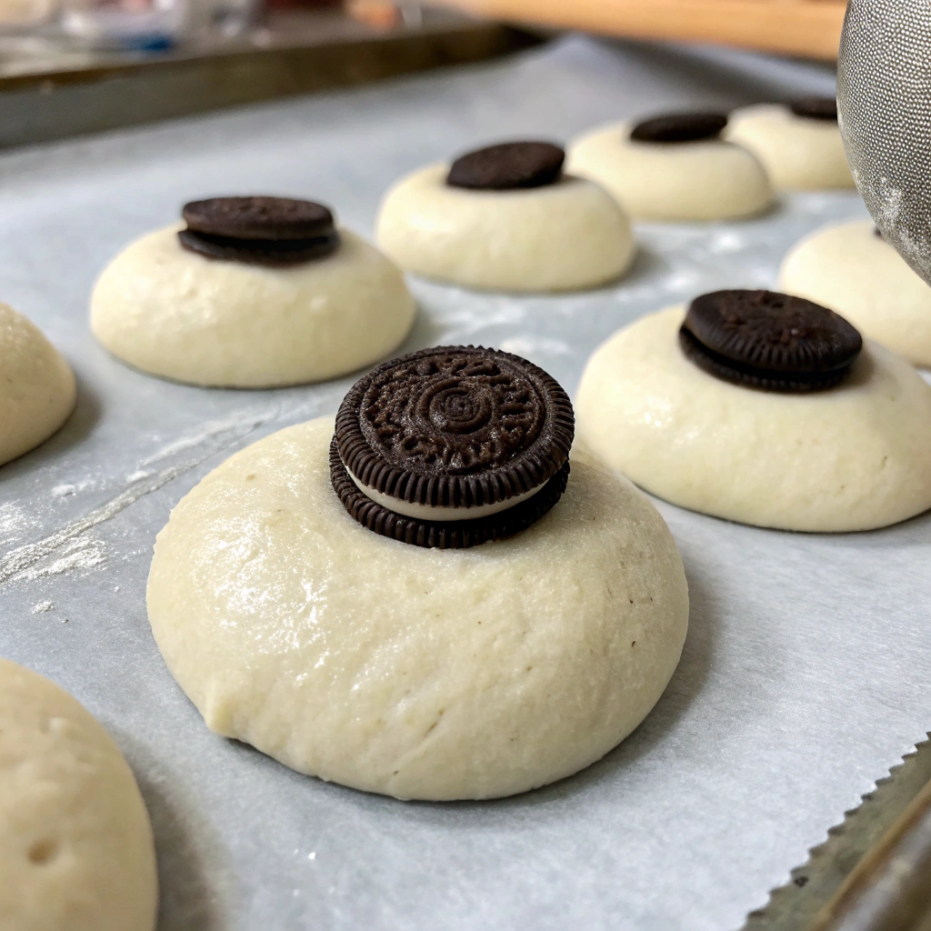 Scoop a tablespoon of dough and flatten it slightly. Place one Oreo on top, then cover it with another tablespoon of dough, sealing the edges completely so the Oreo is hidden inside.