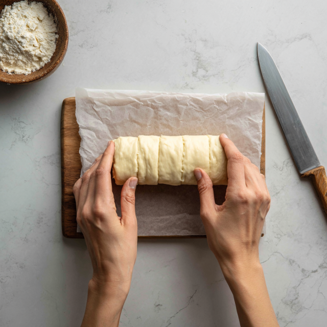 Using the parchment paper to help, gently roll the dough into a log. Slice into 6–8 rolls using a sharp knife or dental floss (yes, it works perfectly for this!).