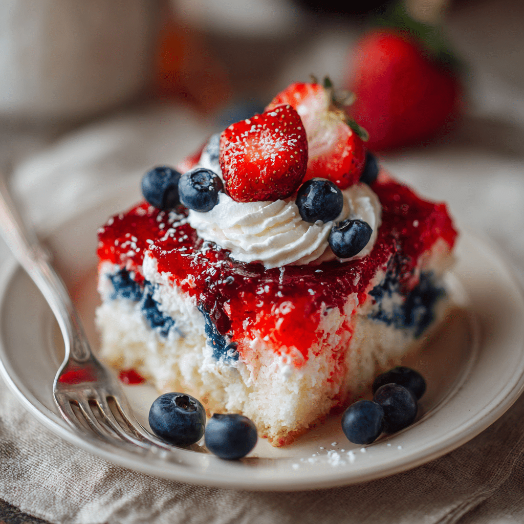 I also love that it’s customizable. You can swap flavors, add fresh berries, or even try different colored Jellos. But for me, the classic red, white, and blue combination is irresistible. It tastes like nostalgia and celebration wrapped into one soft, sweet cake.