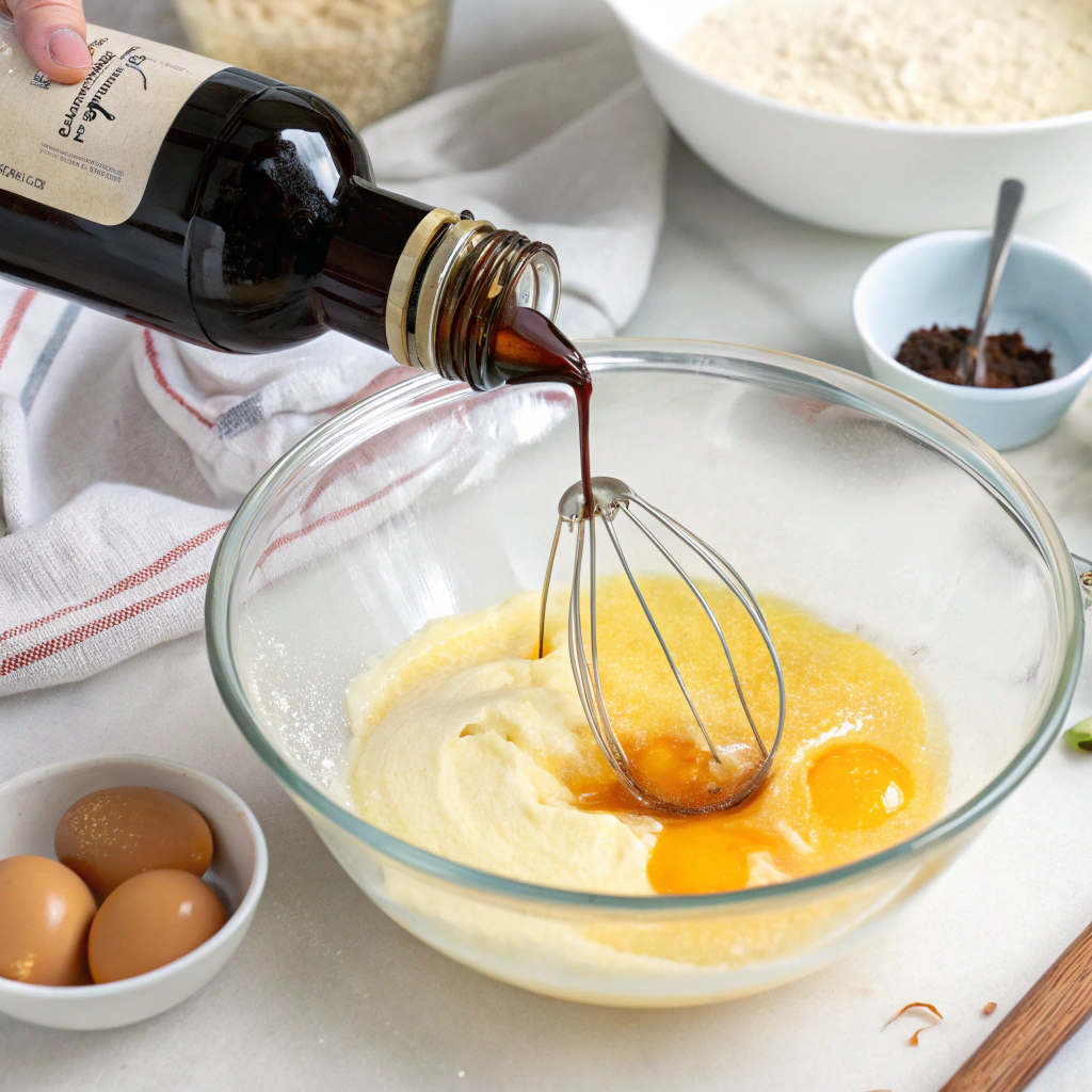 Beat in eggs, one at a time, then add vanilla extract. Ensure the mixture is smooth and uniform.
