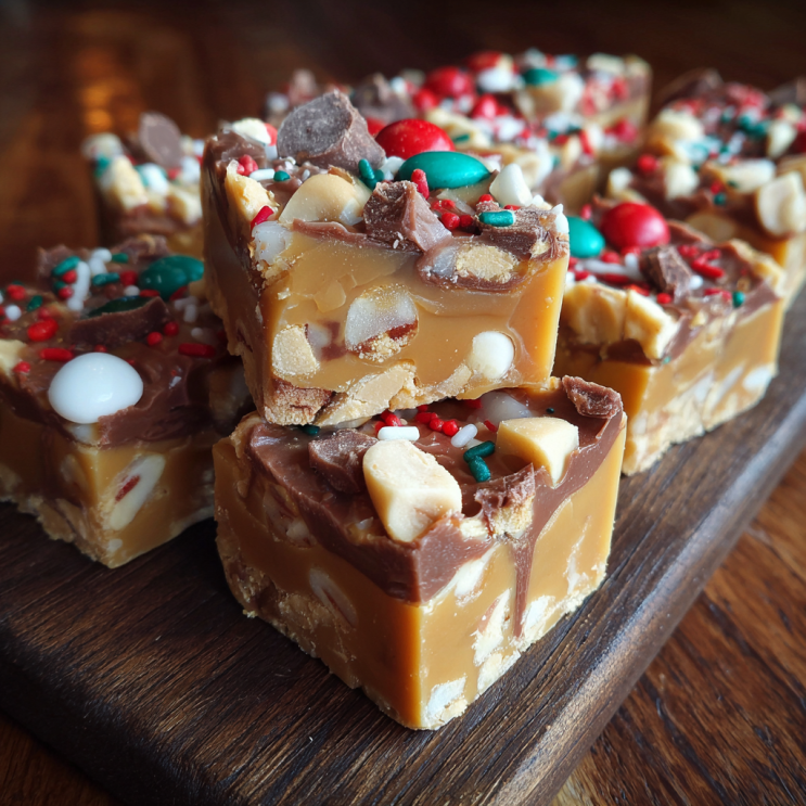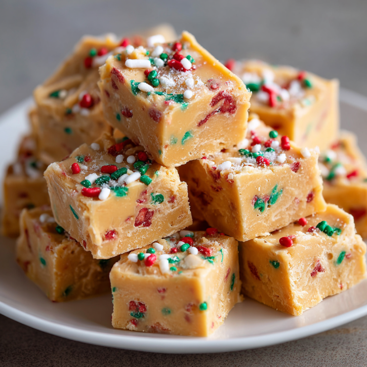 The holidays can get hectic, but this fudge brings a little calm into the chaos. The moment it starts melting on the stovetop and you smell that rich peanut butter aroma filling the room, everything slows down a bit. And once you sprinkle the top with festive decorations red and green sugar, crushed candy canes, or little holiday sprinkles it suddenly feels like Christmas came early.