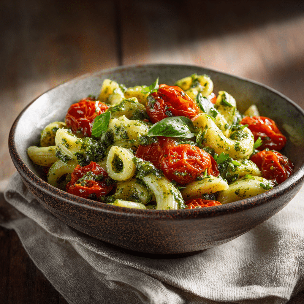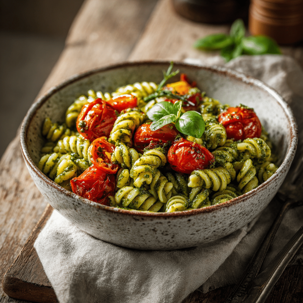 I make pesto pasta with cherry tomatoes when I want something quick, fresh, and comforting. I cook pasta until al dente, then blend basil, garlic, pine nuts, Parmesan, and olive oil into a smooth pesto. I sauté cherry tomatoes until soft and juicy. I toss everything together with a splash of pasta water for a silky finish. This dish comes together in under 30 minutes and always feels special. It’s perfect for busy nights or relaxed dinners with family. Simple ingredients, bold flavors, and a touch of love make this recipe unforgettable every single time.