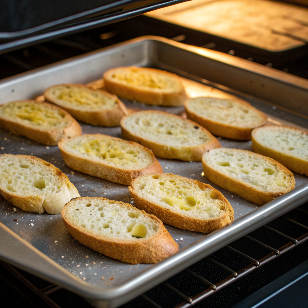 Preheat oven to 375°F (190°C). Arrange baguette slices on a baking sheet, brush lightly with olive oil, and toast for 8–10 minutes until golden and crisp.