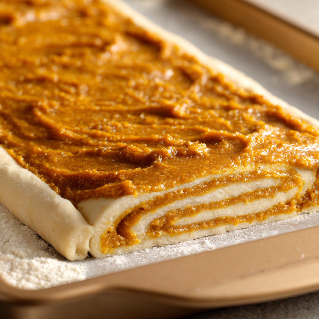 Punch down the dough and roll it out into a rectangle, about 12×16 inches. Spread the pumpkin butter mixture evenly over the dough, leaving a small border around the edges. Gently roll it up from the long side into a tight log, then slice into 12 even rolls.