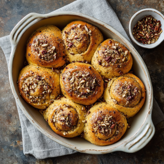 Serve these rolls warm, straight from the oven. Pair with Greek coffee, chai, or hot chocolate. Sprinkle with crushed pecans or cinnamon sugar for extra festive flair. They also work well prepared ahead: refrigerate overnight and bake fresh in the morning.