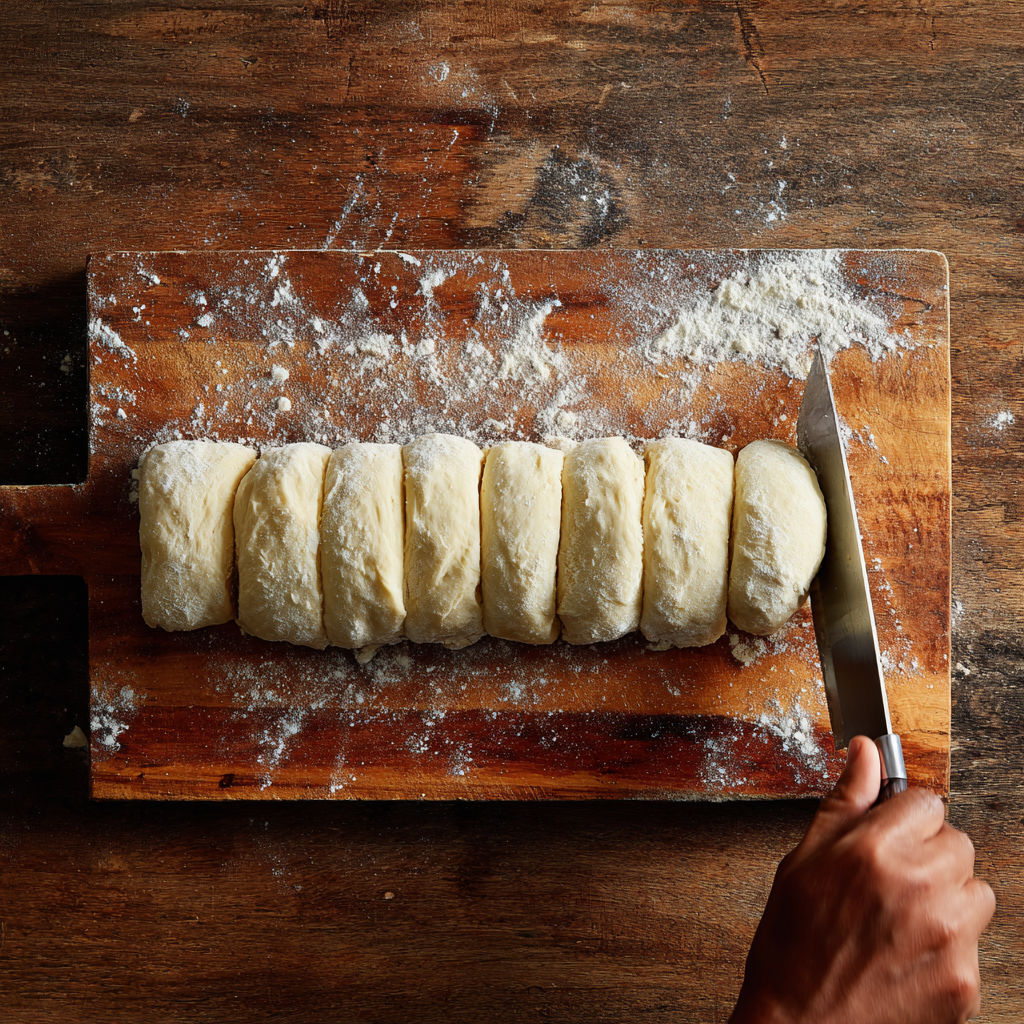 Starting from the long side, roll the dough tightly into a log. Use a sharp knife or unflavored dental floss to cut it into 12 equal rolls.