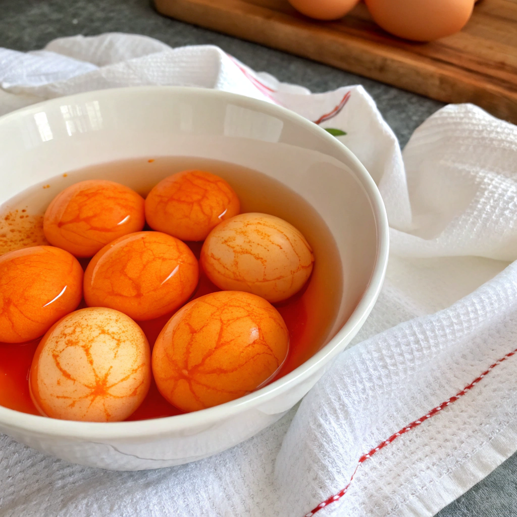 Once cooled, peel the eggs carefully. In a bowl, mix orange food coloring with warm water (about 1 cup water + ½ tsp food coloring). Gently place the peeled eggs in the dye and let them soak for about 10 minutes, turning occasionally for even color.