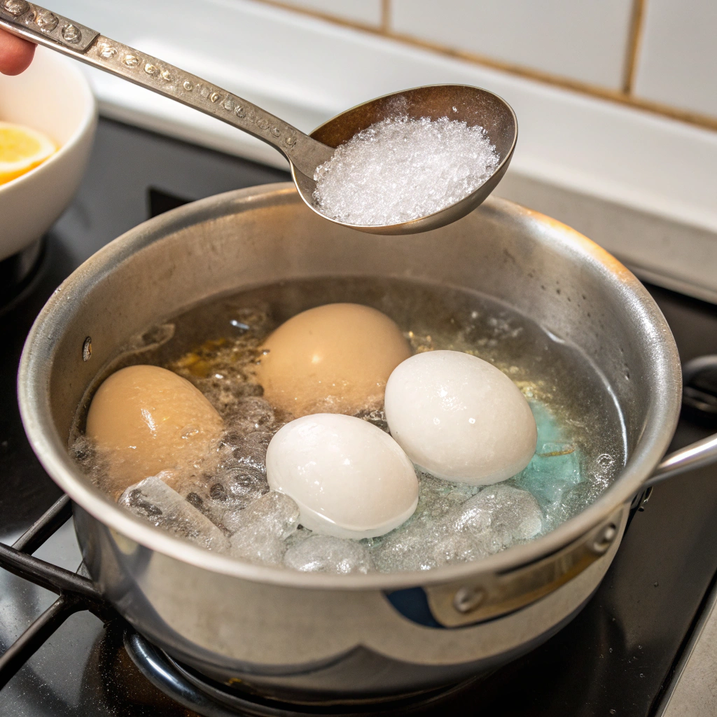 Place eggs in a saucepan, cover with cold water, and add salt and vinegar. Bring to a gentle boil, then reduce heat and simmer for 10 minutes.