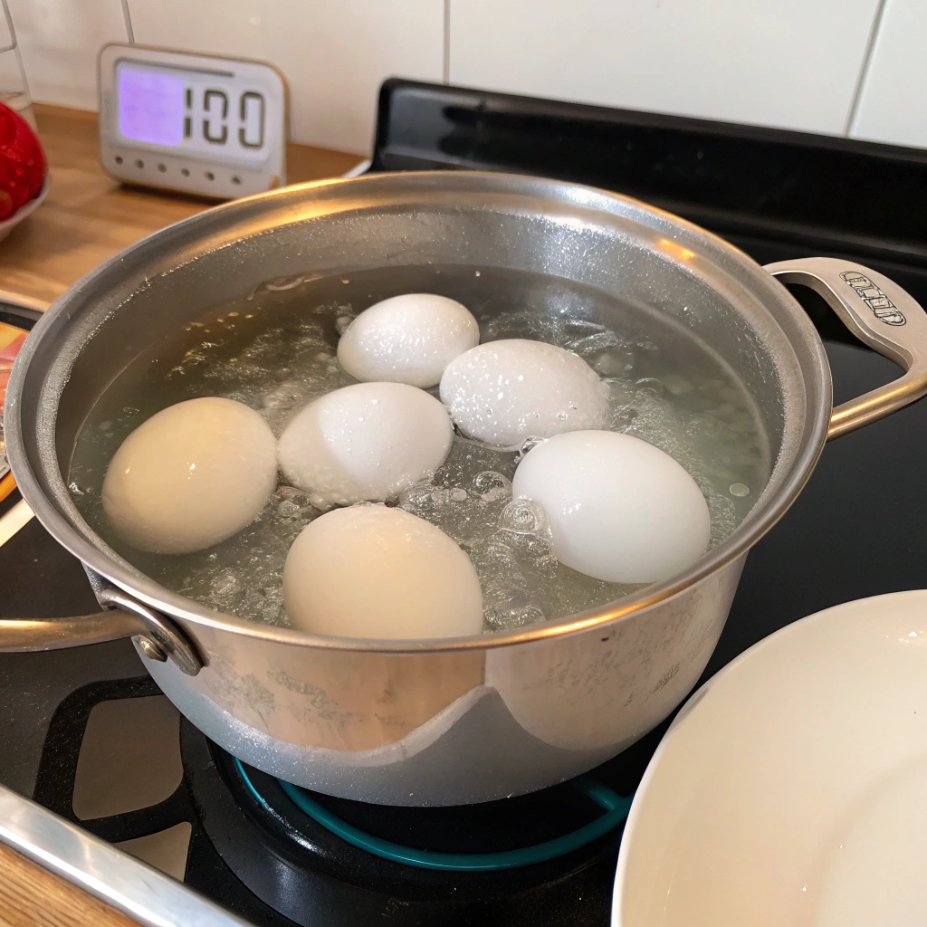 Place the eggs in a medium pot and cover with cold water. Bring to a gentle boil, then reduce the heat and simmer for 10 minutes. Remove from heat and transfer the eggs to an ice bath to cool completely. Peel carefully once cooled.