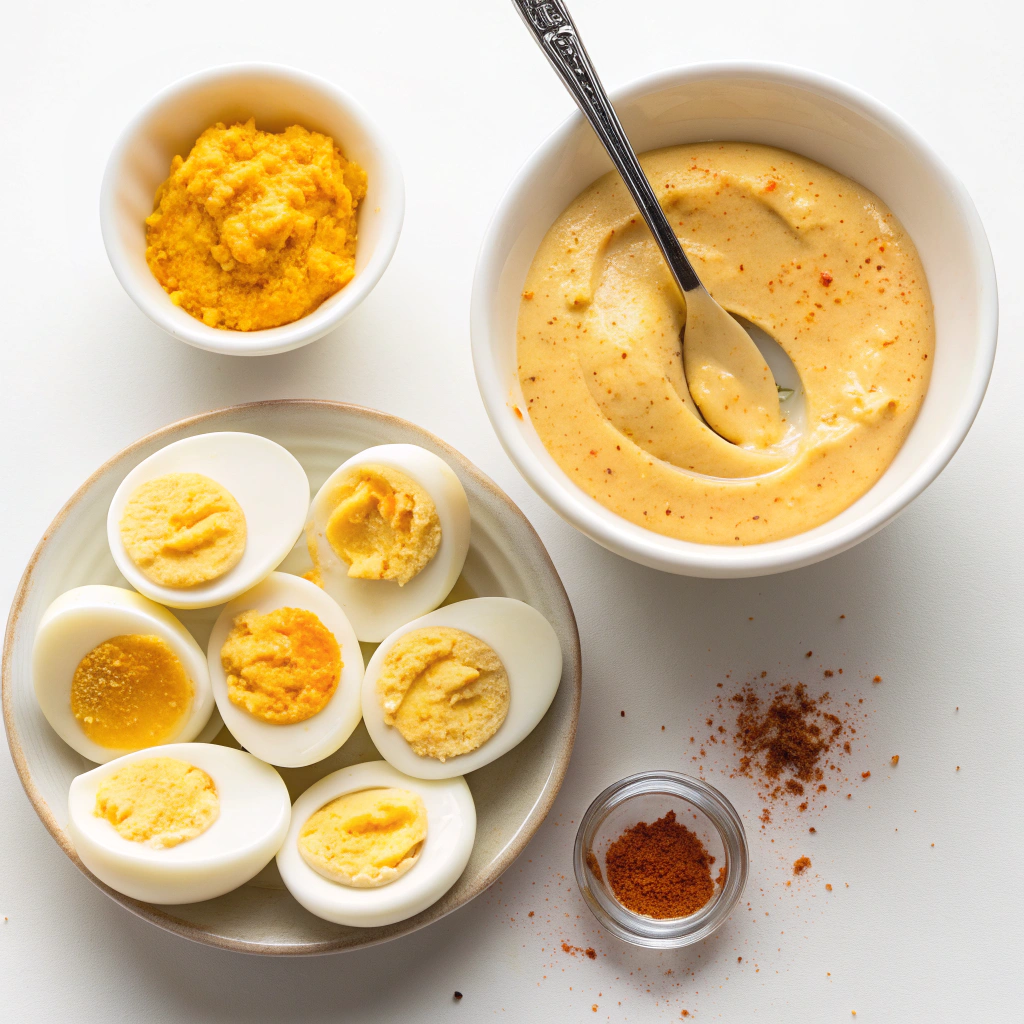 Slice each egg in half lengthwise and gently remove the yolks. Place yolks in a small bowl and mash with a fork until smooth. Add mayonnaise, Dijon mustard, smoked paprika, lemon juice, and a pinch of salt and pepper. Mix until creamy. Add a drop or two of orange food coloring if you want a deeper pumpkin hue.