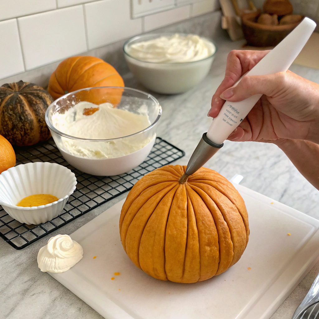 Spoon the filling into a piping bag or a small zip-top bag with the corner snipped off. Pipe the filling into the egg whites, mounding it slightly to create a rounded “pumpkin” shape. Use a toothpick or the back of a knife to lightly draw vertical lines, mimicking a pumpkin’s natural ridges.