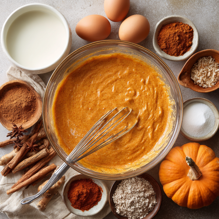 - Mix pumpkin, milk, eggs, sugar, spices, and vanilla.