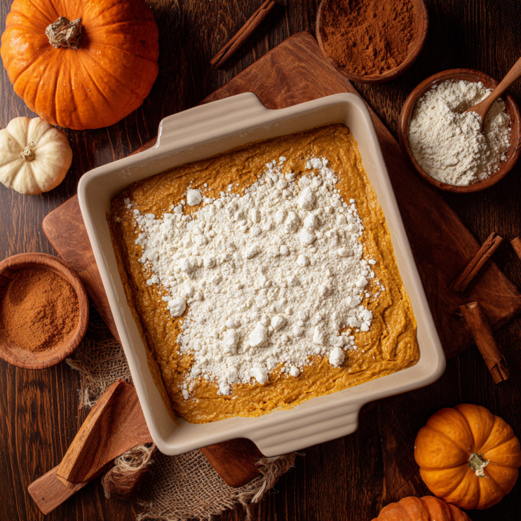 Pour the pumpkin mixture into your prepared baking dish. Then, evenly sprinkle the dry cake mix right over the top of the pumpkin mixture no stirring needed!