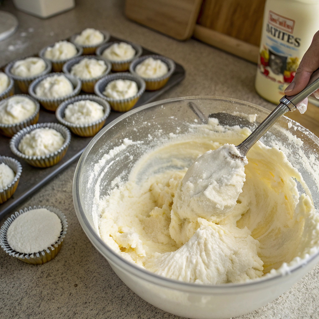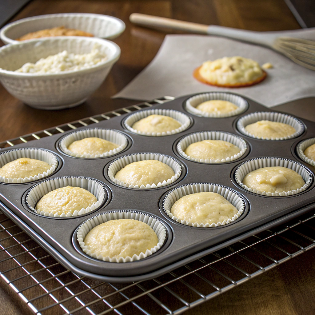 Gradually fold the dry ingredients into the wet mixture. Stir gently until no streaks of flour remain, but don’t overmix to keep the muffins light.