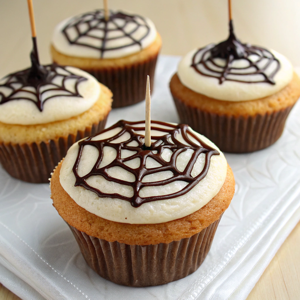 Using melted chocolate or black decorating gel, pipe 3–4 circles on top of the frosted muffins. Drag a toothpick from the center to the edges to create a spiderweb effect.