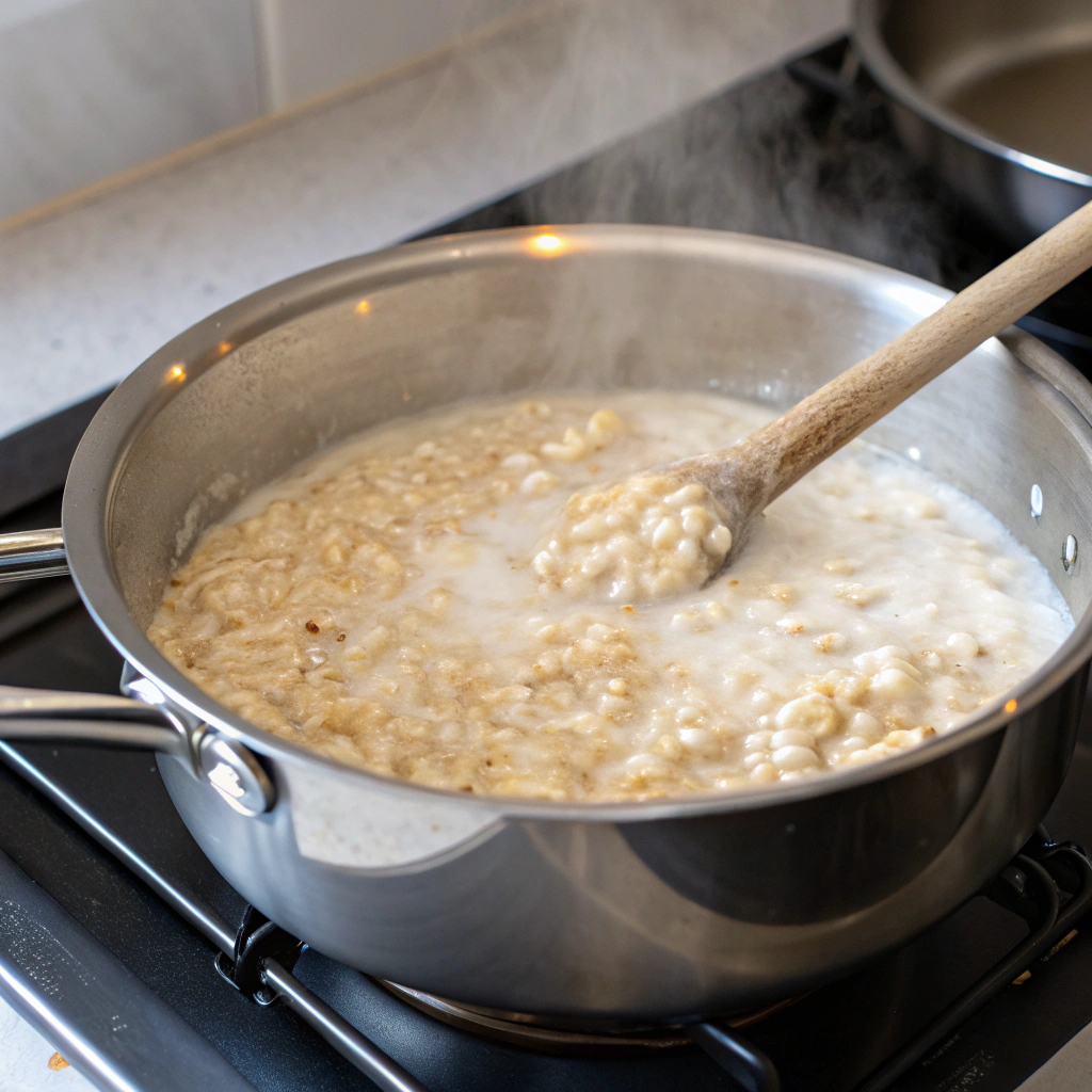 In a medium saucepan, bring the milk and salt to a gentle boil. Stir in the rolled oats and cook for about 5 minutes, stirring often, until creamy.