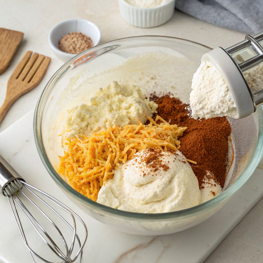 In a medium mixing bowl, combine cream cheese and shredded cheddar. Add garlic powder, onion powder, smoked paprika, salt, and pepper. Mix until smooth and creamy. You can use a fork, spatula, or electric mixer for a fluffier texture.